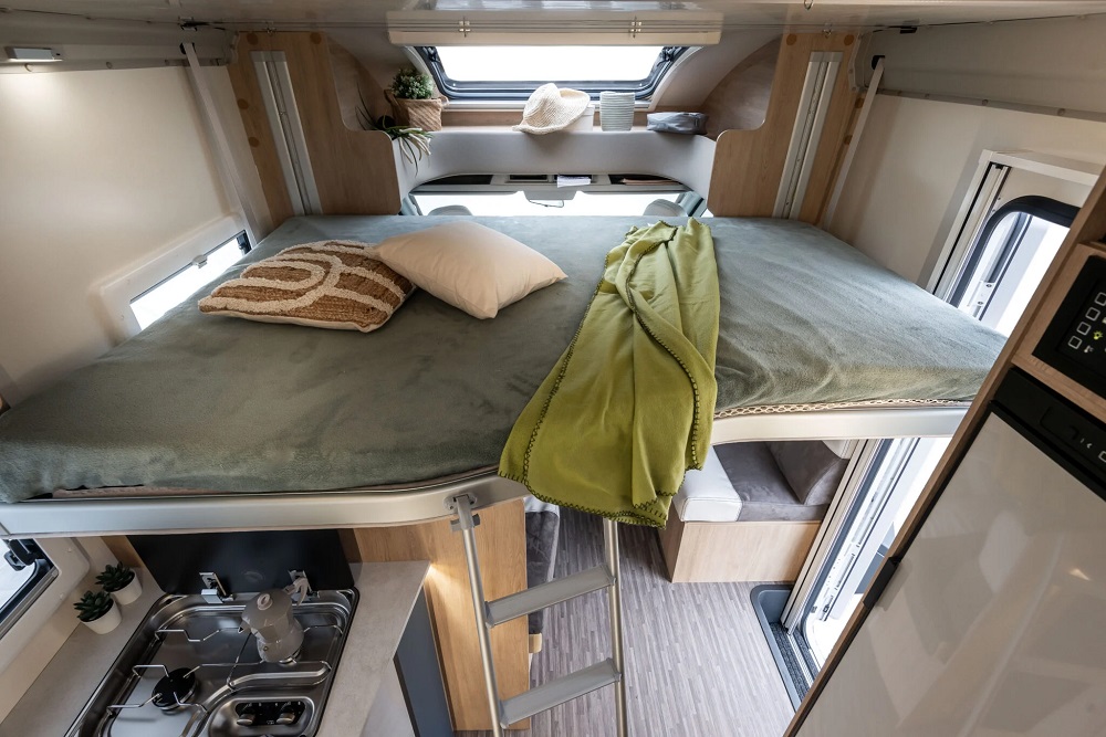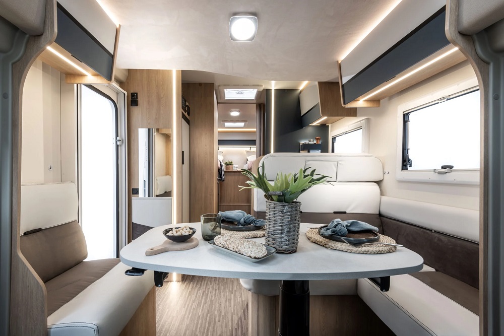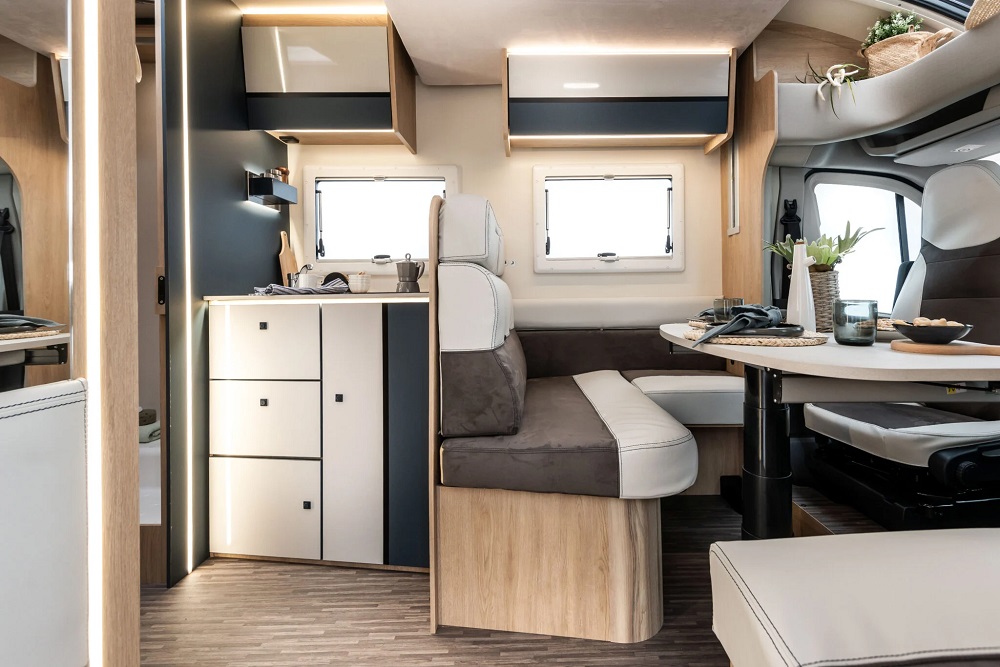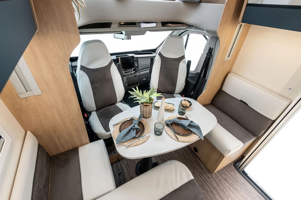 Salón Delantero de Grandes Dimensiones: Gracias a su mayor longitud, el salón en forma de L se beneficia de un espacio diáfano excepcional. Combinado con los asientos delanteros giratorios, crea un área de convivencia central muy amplia, ideal para el día a día. La cama abatible sobre el salón complementa las plazas para dormir.