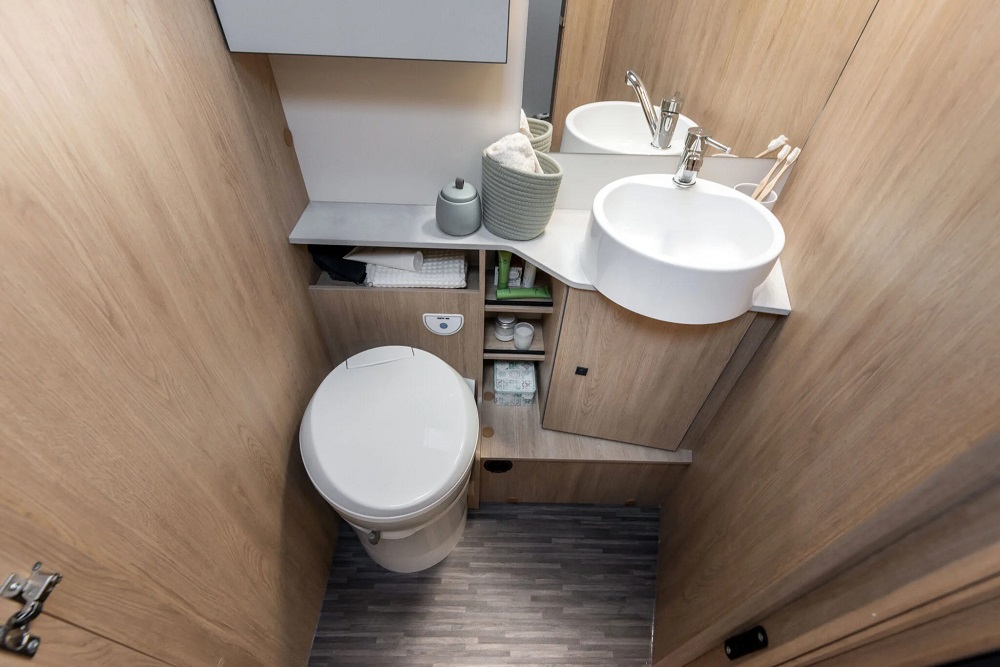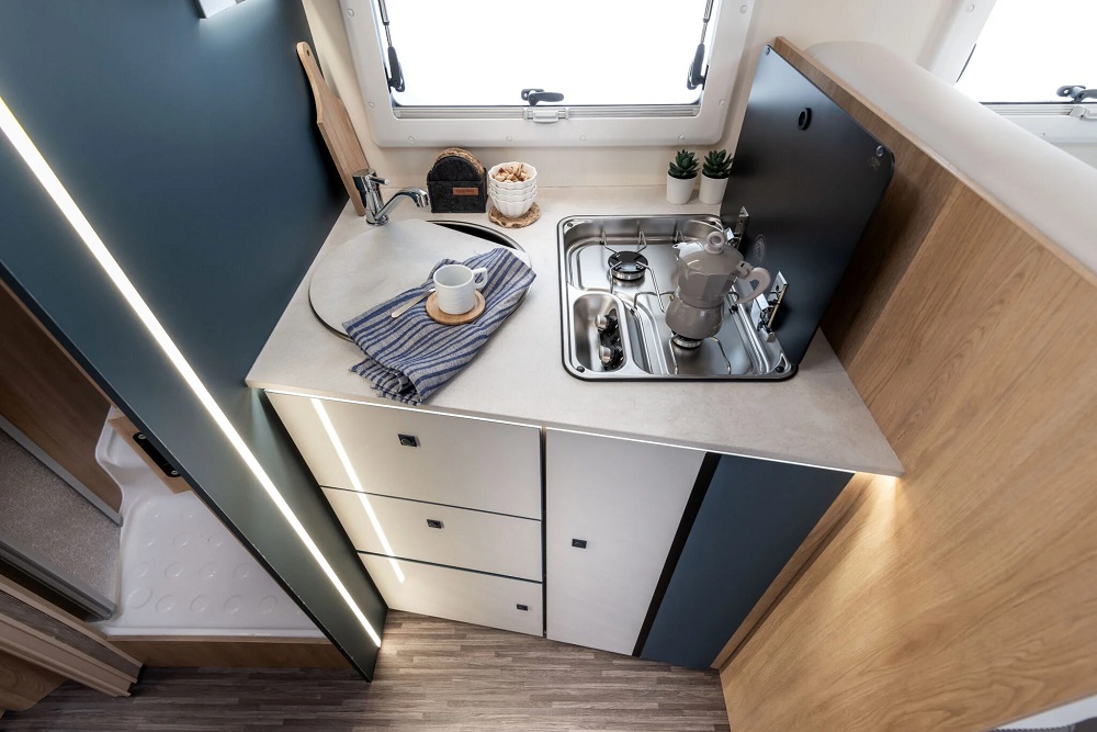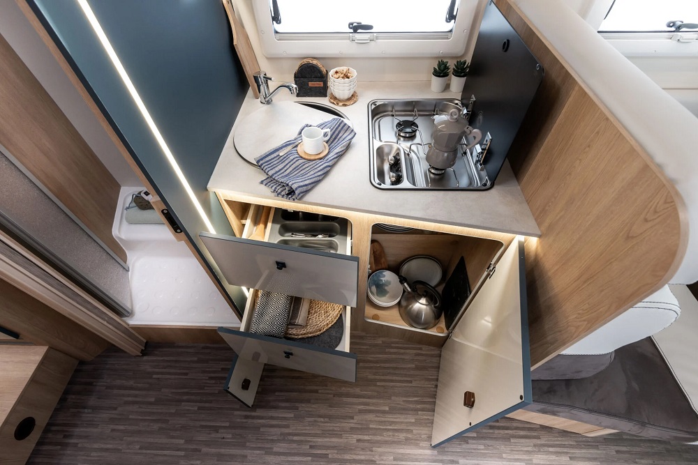 Depósitos: Aguas limpias (100 L) y aguas grises (120 L) / Espacio para 2 botellas de gas (máx. 15 kg)